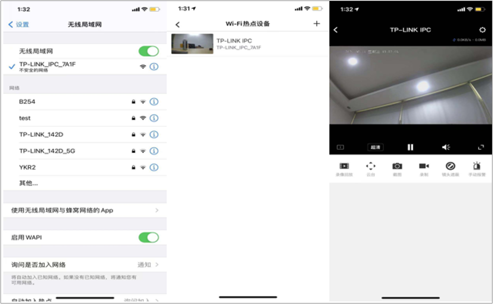 设置好密码后,手机重新连接IPC的Wi-Fi,并成功添加,根据提示格式化SD卡,点击画面即可进行预览、回放、云台控制、语音对讲等操作。