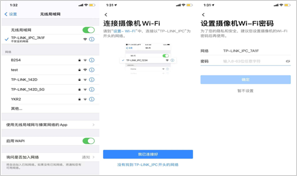 以苹果手机打开【TP-LINK安防APP】为例,点击【我的->设备管理->Wi-Fi热点】,按照向导,将手机连接上摄像头默认的Wi-Fi信号【TP-LINK_IPC_XXXX(MAC后四位)】,并给摄像头设置一个Wi-Fi密码。
