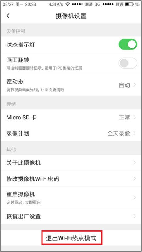 2、切换成热点模式后,仅能通过在APP中点击“退出Wi-Fi热点模式”,退回到之前的模式,无法通过再次短按reset键实现退出;