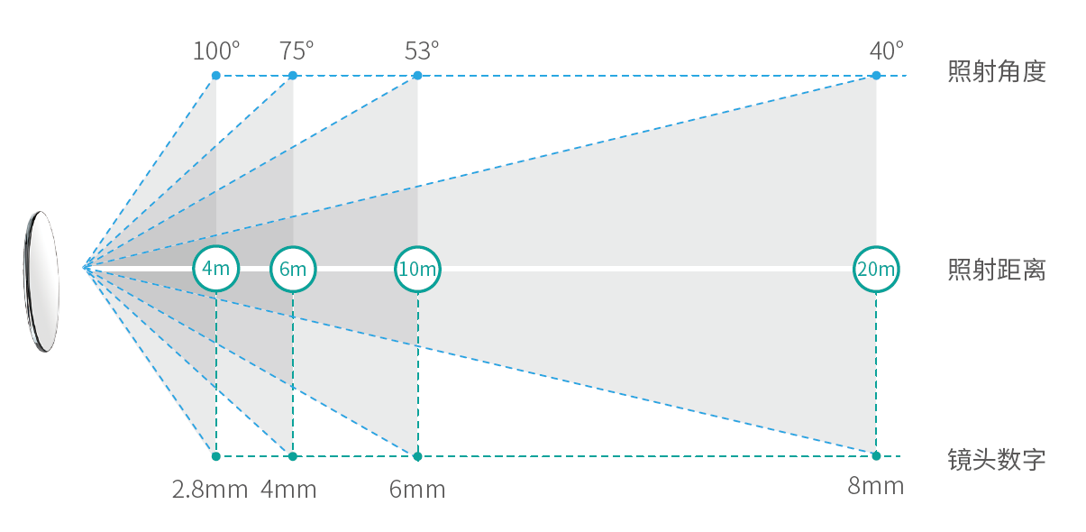 我司IPC镜头焦距有2.8mm/4mm/6mm/8mm/12mm等多种,每个产品系列均可以选择镜头焦距,可以满足室内外各种环境的拍摄需求。一般来说,焦距越大,视场角越小,而监控距离越远。