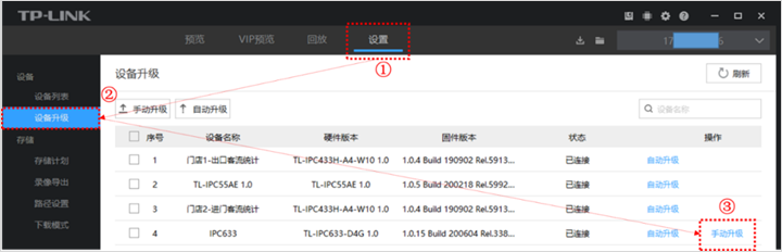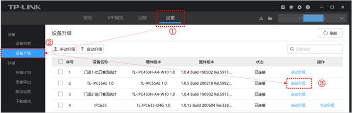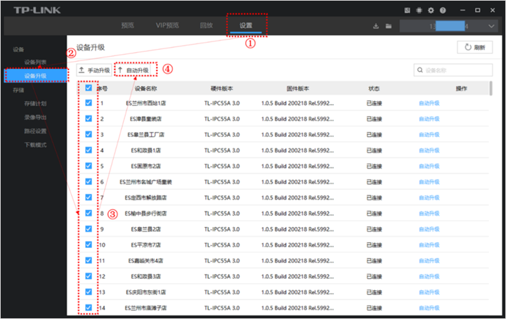 如果TP-LINK ID账号下有多台监控设备需要远程升级,通过电脑安防系统可以一键批量在线升级,选择多台设备在线升级即可。多台设备升级,一键搞定!
