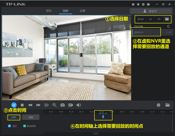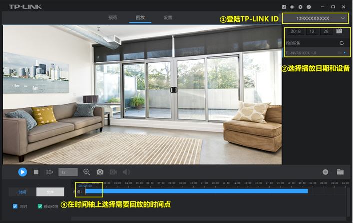 成功添加摄像头,设置录像计划后,TP-LINK安防系统客户端会将录像保存在电脑,客户端回放录像的方法如下: