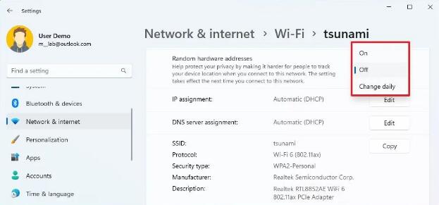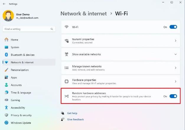 • 要在 Windows 11 上启用随机硬件地址 (MAC),请在 Wi-Fi >打开>网络和互联网设置“设置”并打开“随机硬件地址”功能,或在无线连接属性页面内,选择“打开”或“每天更改”选项随机硬件地址“设置。