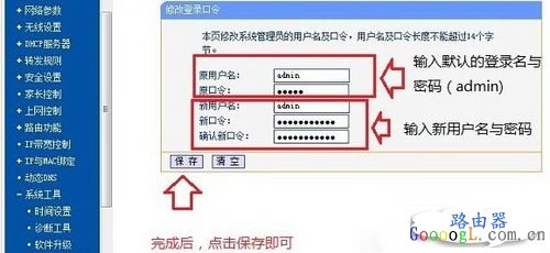 第三步:点击修改口令后,右侧即可弹出修改口令对话框,然后上边先输入默认用户名与密码,下边填写上新的用户名与密码,如下图,这里我只修改密码,用户名依然用的是admin,想要连用户名也一起修还的用户,请自行填写,如下图: