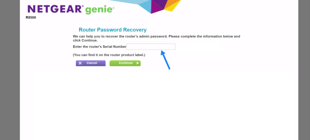 4,如果启用了密码恢复,则将提示您输入路由器的序列号,该序列号可以在路由器后面找到。