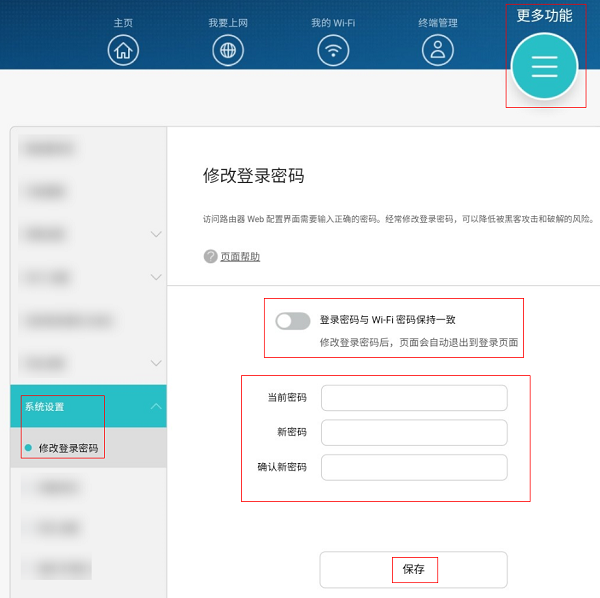 在“当前密码”区域输入当前密码,在“新密码”区域输入新的密码,在“确认密码”区域再次输入新密码确认,并单击“保存”。