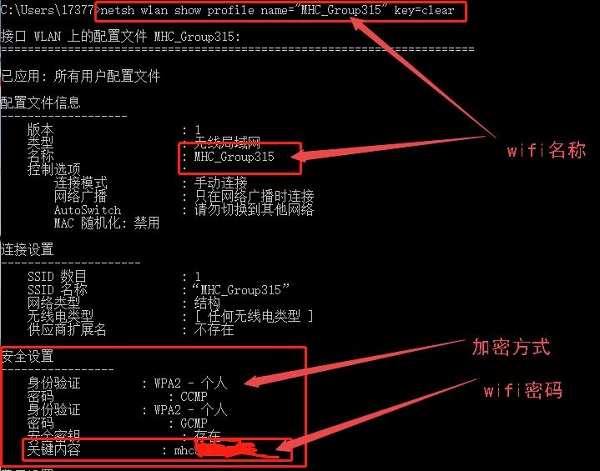 6;命令提示符将会显示此 WiFi 网络的密码,在其【安全设置】下的【关键内容】。