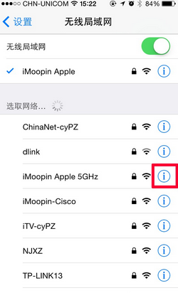 1、依次进入设置>无线局域网,找到需要连接的无线网,点击后方蓝色圈住的“i”帮助图标。