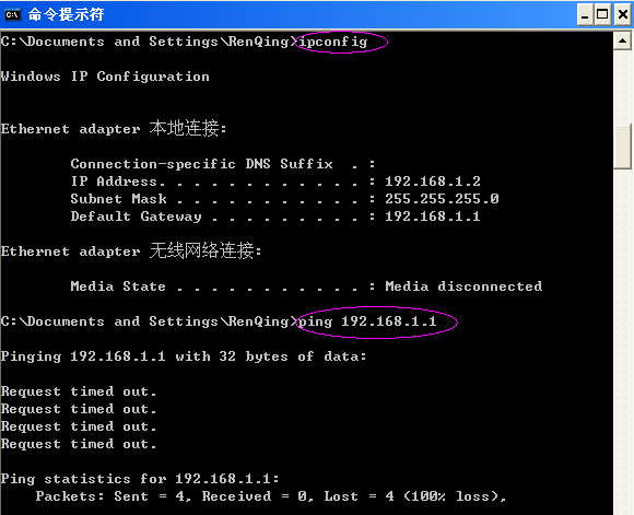 当获得了新的IP地址后,可以使用ping检查一下,一旦能ping通路由器了,说明电脑与路由器的连接已正常: