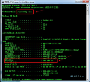 第四步:输入命令“ipconfig /all”,回车,然后再里面找到默认网关,就是类似于192.168.1.1这样的字符,里面显示的IP地址就是我们路由器的登陆地址。
