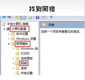 第二步:点击计算机,找到管理模板,然后再找到网络;