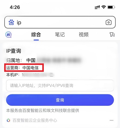 拿出你已经连接到WIFI的手机,打开百度浏览器或APP,在搜索框中输入“IP”;此时,百度会提供一个IP查询结果。如下图,上面会标注你当前设备的公共IP和运营商信息。