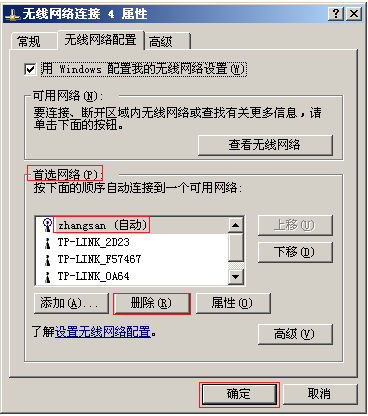 设置方法:电脑桌面上找到网上邻居,右键点击并选择属性,找到无线网络连接后,右键点击并选择属性,点击无线网络配置,在首选网络的列表框中,选中路由器的信号,点击删除,再点击确定。如下图所示: