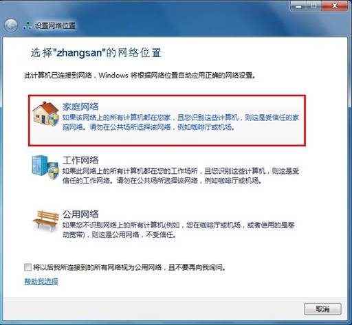 第三步:当出现设置网络位置的对话框时,可根据实际应用环境选择网络的位置,本文以家庭网络为例。如下图所示: