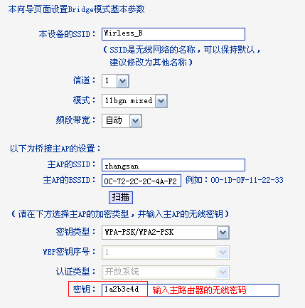 确认方法:请先确认主路由器的SSID与无线密码,然后在Mini路由器Bridge设置中,确认填写参数正确。如下图: