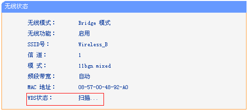 登录路由器管理界面,点击运行状态>>无线状态,观察WDS状态的显示,如果显示WDS(桥接)状态一直显示扫描、初始化、连接状态,如下图所示: