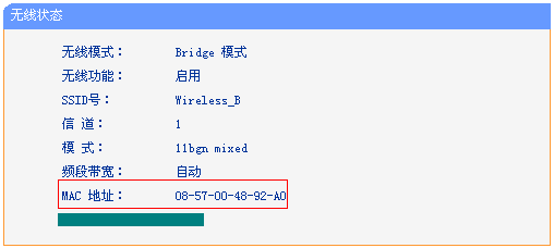 MAC地址查询方法:登录路由器管理界面,在运行状态>>无线状态可查看到该MAC,如下图所示: