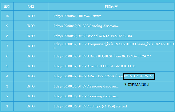 部分路由器的系统日志中会记录路由器给终端分配IP地址的过程,这个过程中记录了终端的MAC地址,且MAC地址的格式为:XX:XX:XX:XX:XX:XX,如下图: