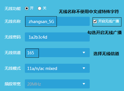 解决办法:登录路由器管理界面,检查路由器的无线设置,具体请参考无线路由器的说明书。如使用TP-LINK无线路由器,登录路由器界面后,点击路由设置>>无线设置,修改无线名称为数字、字母的组合。信道推荐使用149、153、157、161、165中的任一个。同时确保勾选了开启无线广播,如下图。