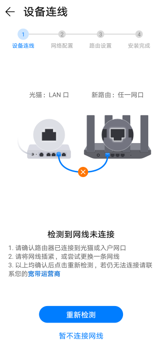 华为路由器首次配置时,入户网线已插好,依旧提示未检测到入户网线或者检测到网线未连接。