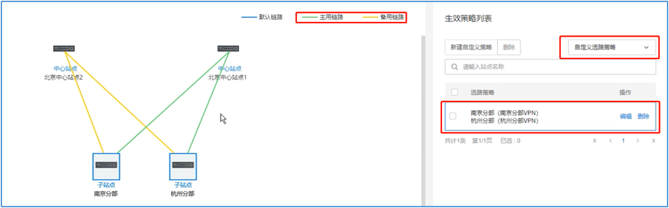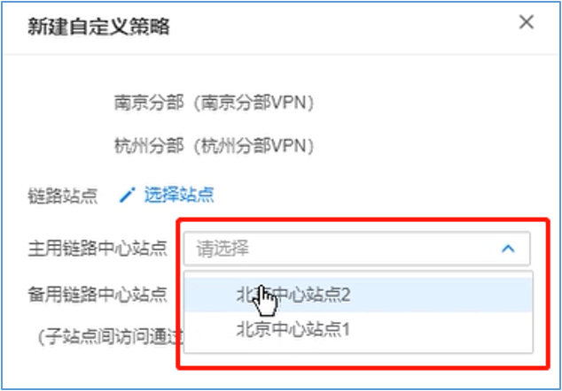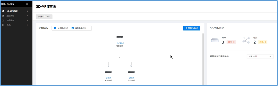 当SD-VPN隧道搭建好了之后,有多个中心站点的情况下,可以配置各分站点的主用链路和备用链路,实现整个VPN网络的负载均衡和链路备份。