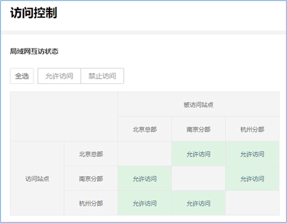 当SD-VPN隧道搭建完成后各站点默认可以互访,如果需要控制某些站点部分或全部网段不能互访,可以在访问控制页面设置控制条目。