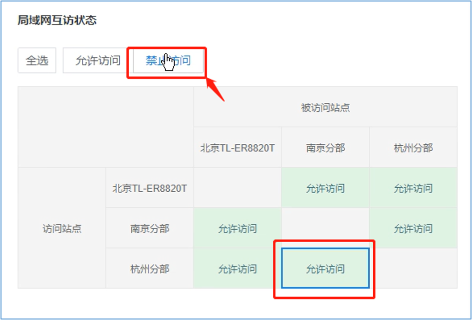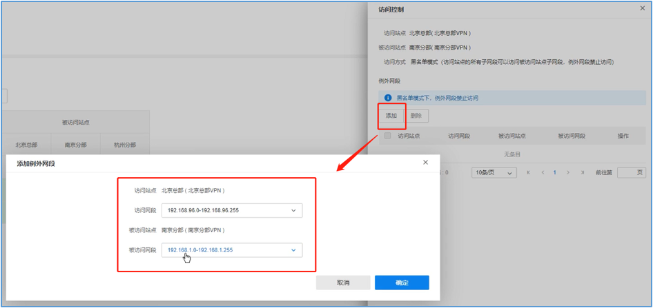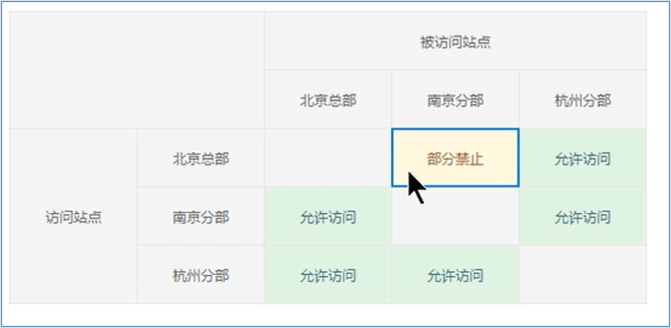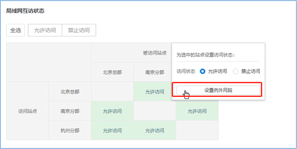 此时杭州分部则不可以访问南京分布。还可以点击设置例外网段禁止站点之间的部分网段互访: