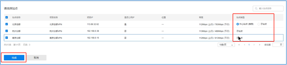 勾选设备并选择中心站点进行SD-VPN隧道搭建: