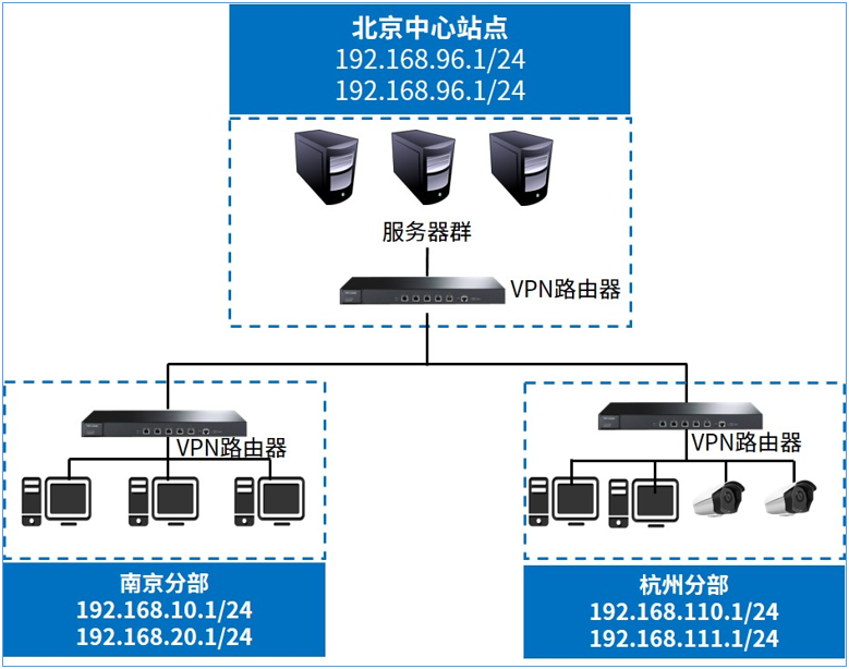 某企业的业务分布在北京,南京和杭州三个地方,北京为企业总部,现在需求总部和分部之间需要实现互联互通,能够正常访问各个地方部门的内网资源。
