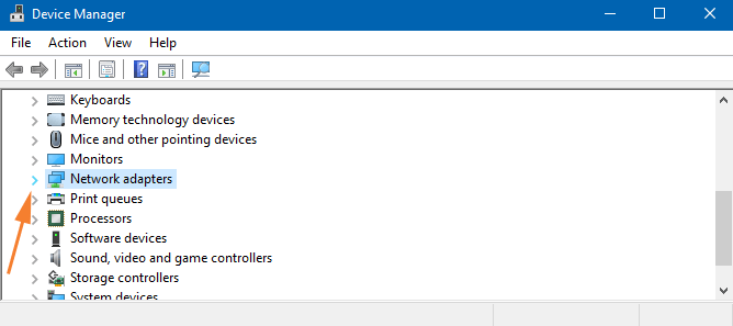 步骤2:现在,在设备管理器上找到网络适配器并双击它。或者,您也可以单击位于类别左侧的箭头。
