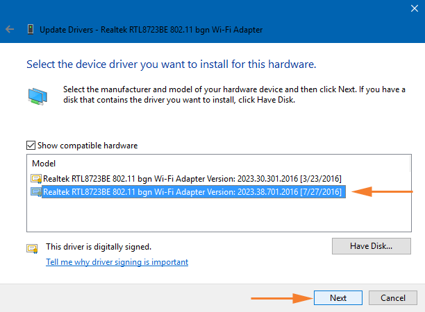 步骤7:这将显示您的 PC 拥有的无线适配器的所有版本。因此,选择最新版本,然后单击下一步.