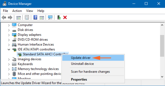 步骤3:您将看到标准 SATA AHCI 控制器。右键单击它,然后从出现的选项中单击“更新驱动程序”.
