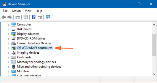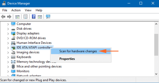步骤2:找到并右键单击类别 IDE ATA/ATAPI。菜单上将显示两个选项,单击“扫描硬件更改”.