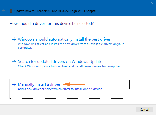 步骤5:现在,在“更新驱动程序”向导中,有三个选项可用。单击最后一个选项手动安装驱动程序.