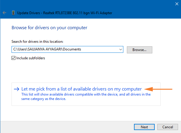步骤6:在即将到来的窗口中,选择“让我从计算机上的可用驱动程序列表中进行选择”。