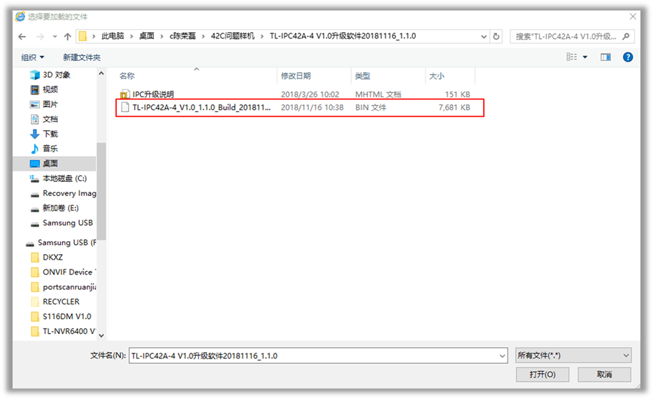 点击“浏览”按钮,找到IPC解压后的升级软件,选中bin文件并点击打开,如下:
