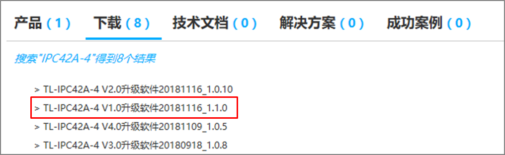 在TP-LINK官网下载中心的搜索栏内输入型号搜索,本例中输入TL-IPC42A-4,搜索结果如下: