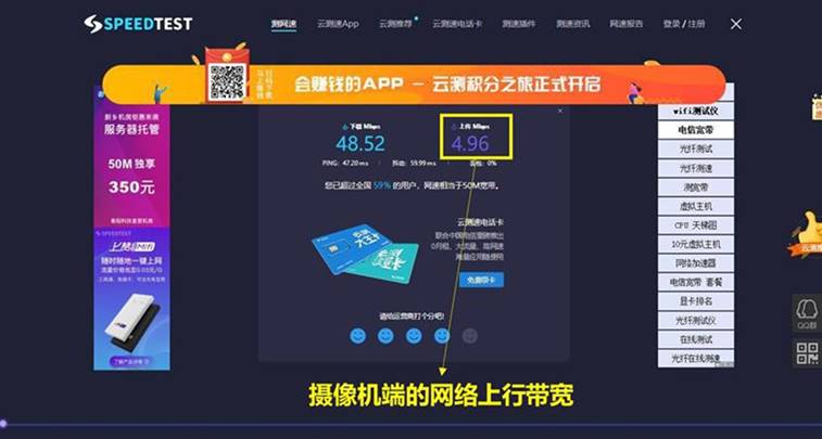 这个因素影响较小,但也需要进行排查。可以使用手机或电脑测试设备端的上行带宽,与所接入的摄像头的主码流码率进行对比评估是否有超过实测上行带宽。通常一台摄像机的所需上行带宽大概为1Mbps。