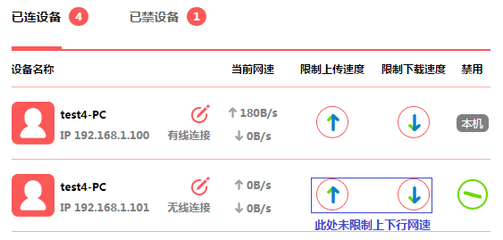 主路由器限制了终端的网速,会影响到终端设备的网速测试。请在测速时,确认主路由器未限制终端网速,如下图: