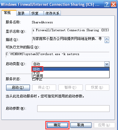 3、在右侧服务列表栏中,选择“Windows Firewall/ Internet Connection Sharing(ICS)”服务,右击并选择属性,将“启动类型”修改为“自动”,并点击“确定”。
