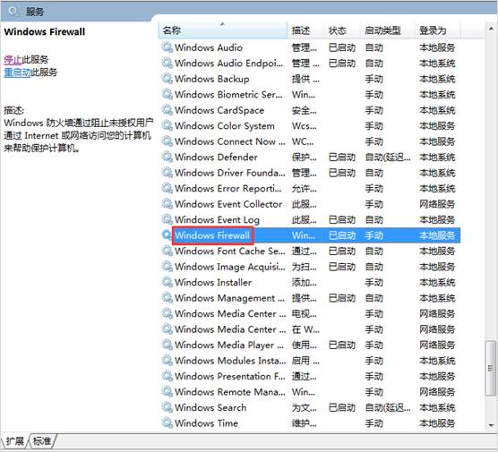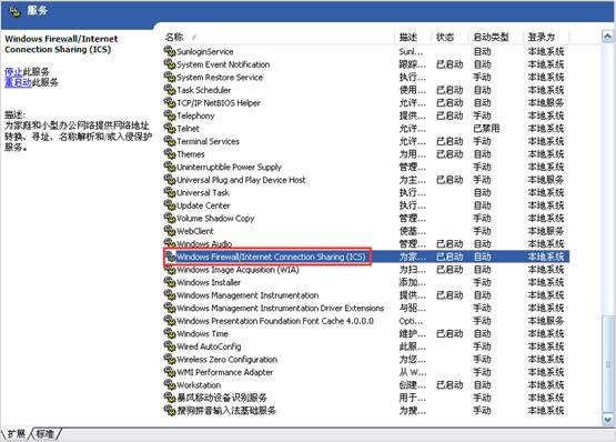 3、在右侧服务列表栏中,分别选择“Windows Firewall”和“Internet Connection Sharing(ICS)”服务(Win8.1系统只需开启ICS服务),右击并选择属性,将“启动类型”修改为“自动”,并点击“确定”。