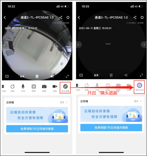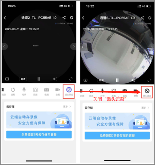在使用过程中无意间或人为故意点击了“镜头遮蔽”功能,导致当前无法显示画面。那如何关闭“镜头遮蔽”呢?答案就是点击“镜头遮蔽”的紫色按钮,即可恢复显示正常监控画面。
