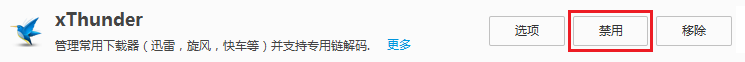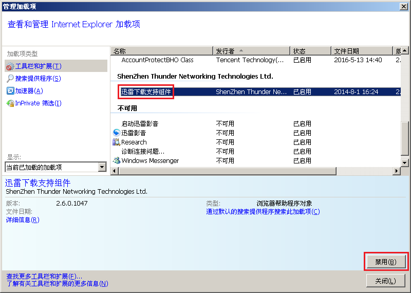 IE浏览器中点击工具>管理加载项,禁用“迅雷下载支持组件”,并重启浏览器。