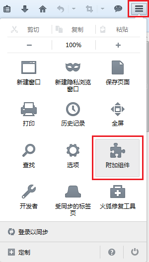 火狐浏览器中点击打开菜单>附加组件,如下。
