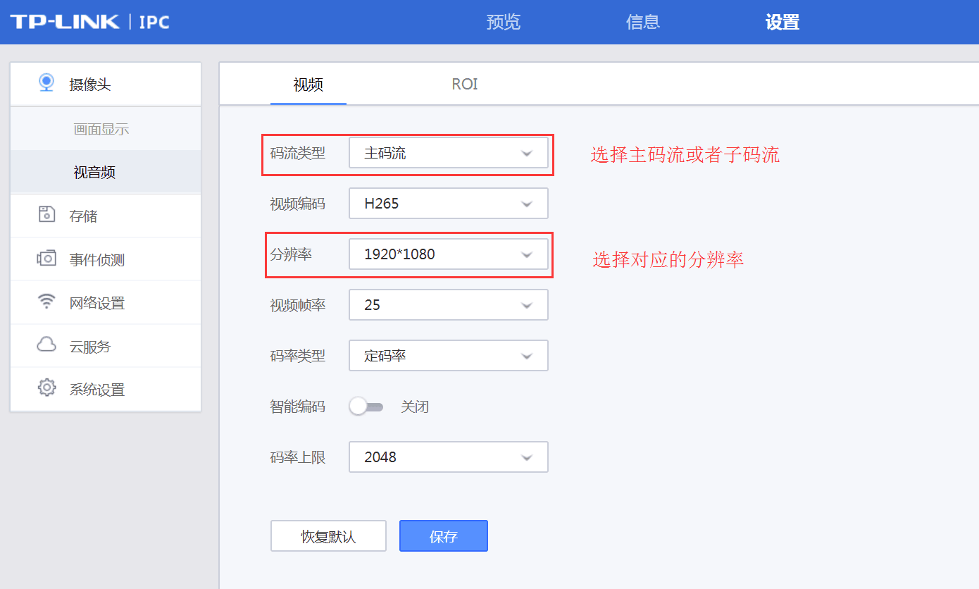 二、降低摄像机的分辨率 如果多个IPC的子码流分辨率之和超过海康NVR的解码能力上限,就会显示成黑屏的状态,所以只需降低IPC的子码流分辨率即可。 如果单个IPC的主码流分辨率超过海康NVR的解码能力上限,就会显示成黑屏的状态,所以只需降低IPC的主码流分辨率即可。