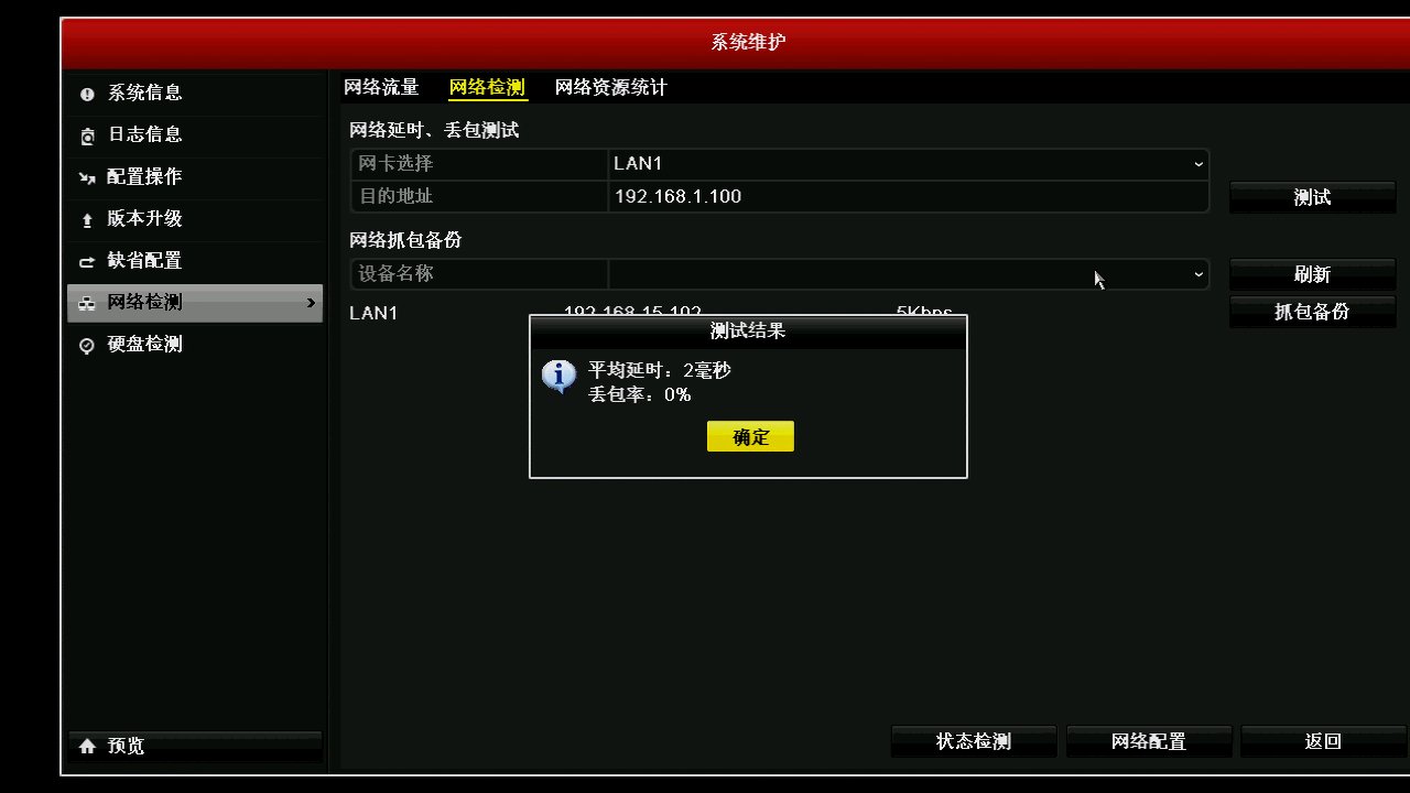 在录像机的【主菜单>系统维护>网络检测】处输入摄像机的IP地址,然后进行测试,查看线路是否存在丢包或者不稳定的情况。
