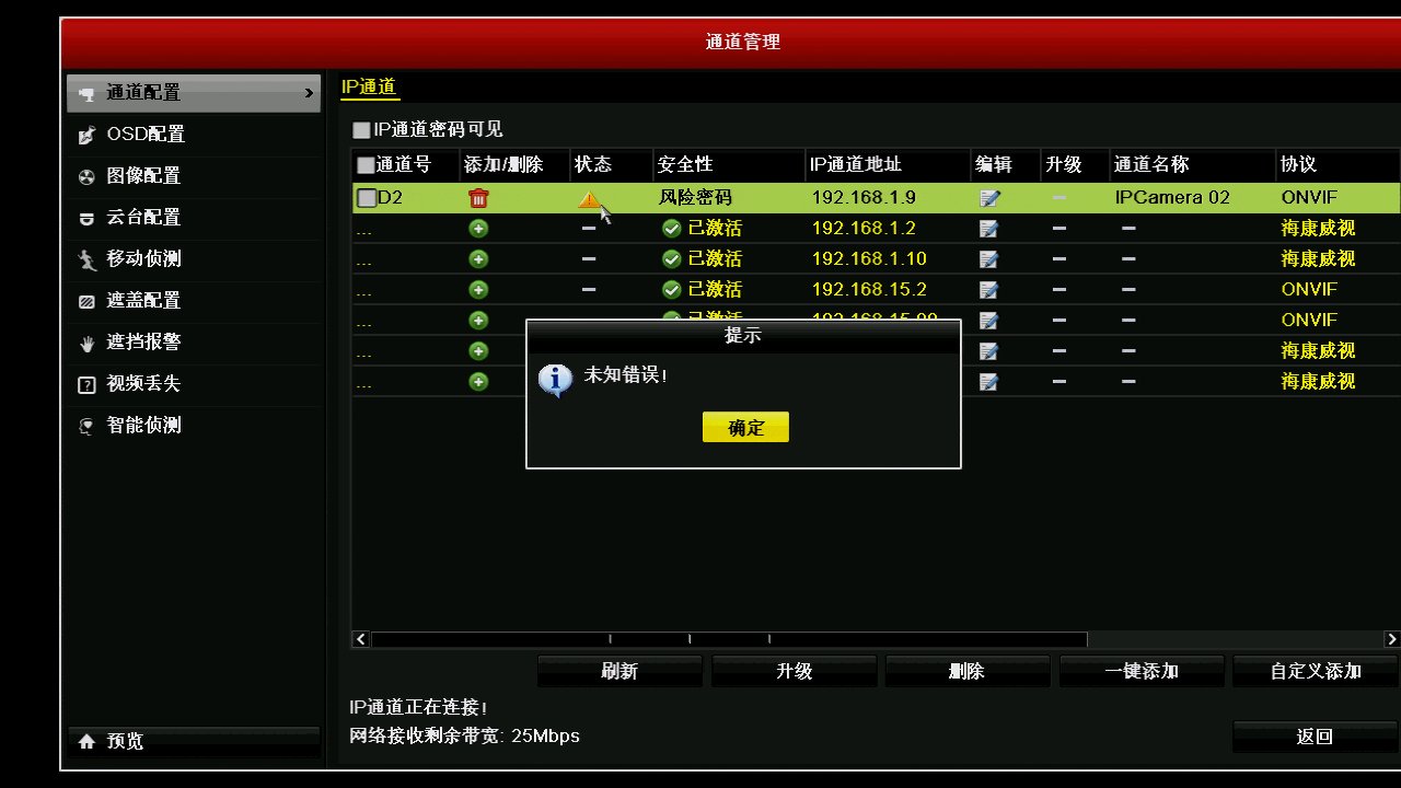 海康NVR的IP通道管理中,添加TP-LINK IPC后,IPC状态变为黄色三角叹号,预览画面均无法显示。点击黄色三角叹号,会出现提示“未知错误”。
