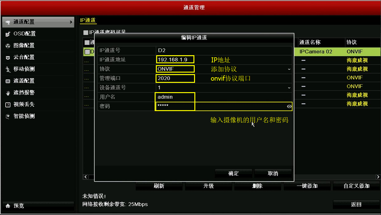 步骤二、添加IPC时确认以下几个信息是否正确: IP地址:确认是摄像机的IP 协议:选择ONVIF协议添加 管理端口:TP-LINK IPC的ONVIF管理端口为2020 用户名密码:输入正确的用户名和密码