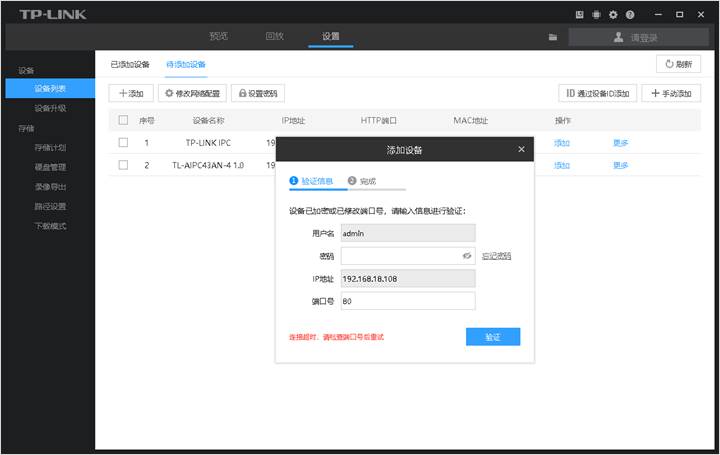 出现问题后,我们可以做以下排查的手段: 确认IPC的连接状态是否断开或不在线 排查方法: 电脑刷新客户端的待添加设备列表; 若IPC在线,则可在待添加设备列表中看到IPC条目;