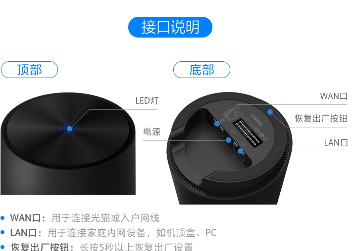 1.连接电源,将外网网线连接至路由器WAN口(球状标识)等待顶灯黄色闪烁变为蓝色闪烁;